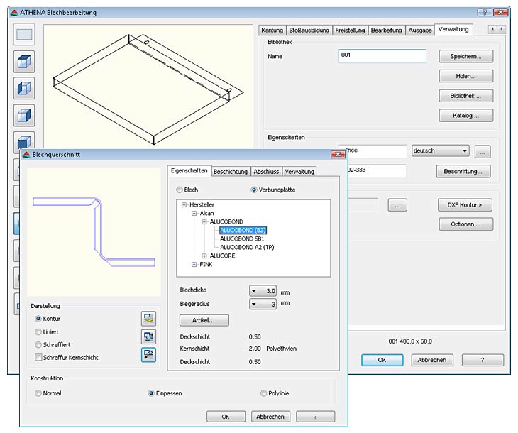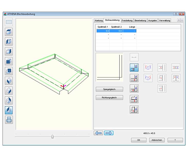 Des données de base, comme par ex. du matériel, d'une épaisseur de tôle et d'un rayon de pliage, sont la base de la tôle à concevoir. La tôle reçoit sa forme de base sur une boîte de dialogue ou sur un contour libre d'une tôle ATHENA. Alors les différentes arêtes sont placées et copiées de la manière la plus simple sur des côtés voisins ou opposés.